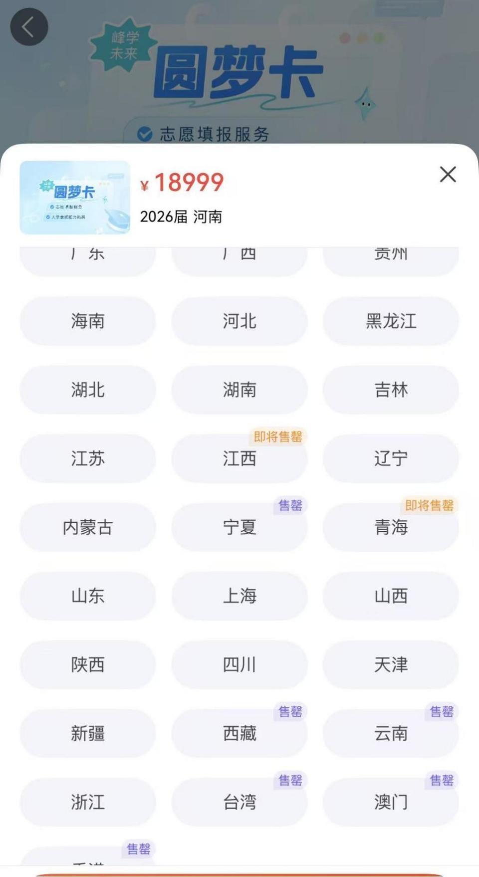 即便价格远超普通志愿填报服务,这两档高端产品依旧受到家长和学生的追捧,在广西、宁夏、云南等多个地区提前售罄。