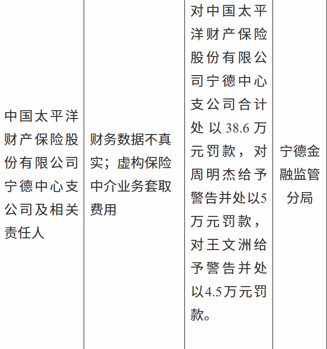 4月13日,宁德金融监管分局行政处罚信息公示表显示,中国太平洋财产保险股份有限公司宁德中心支公司因财务数据不真实;虚构保险中介业务套取费用被合计处以38.6万元罚款,责任人周明杰被给予警告并处以5万元罚款,王某洲被给予警告并处以4.5万元罚款。