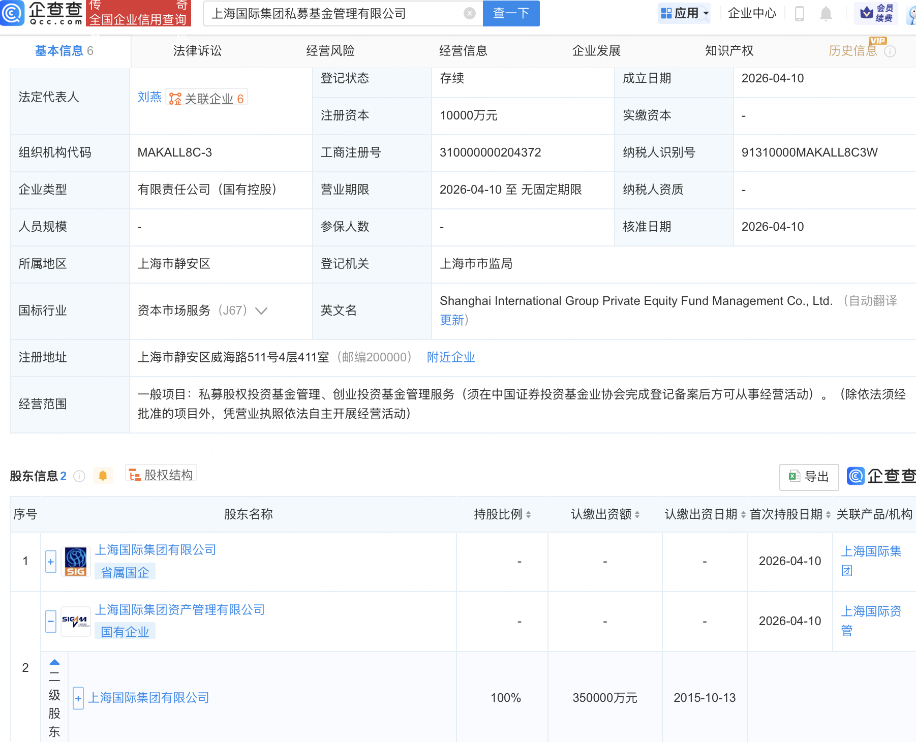 近日,上海国际集团私募基金管理有限公司成立,注册资本1亿元,经营范围包含:私募股权投资基金管理、创业投资基金管理服务。企查查股权穿透显示,该公司由上海国际集团有限公司间接全资持股。